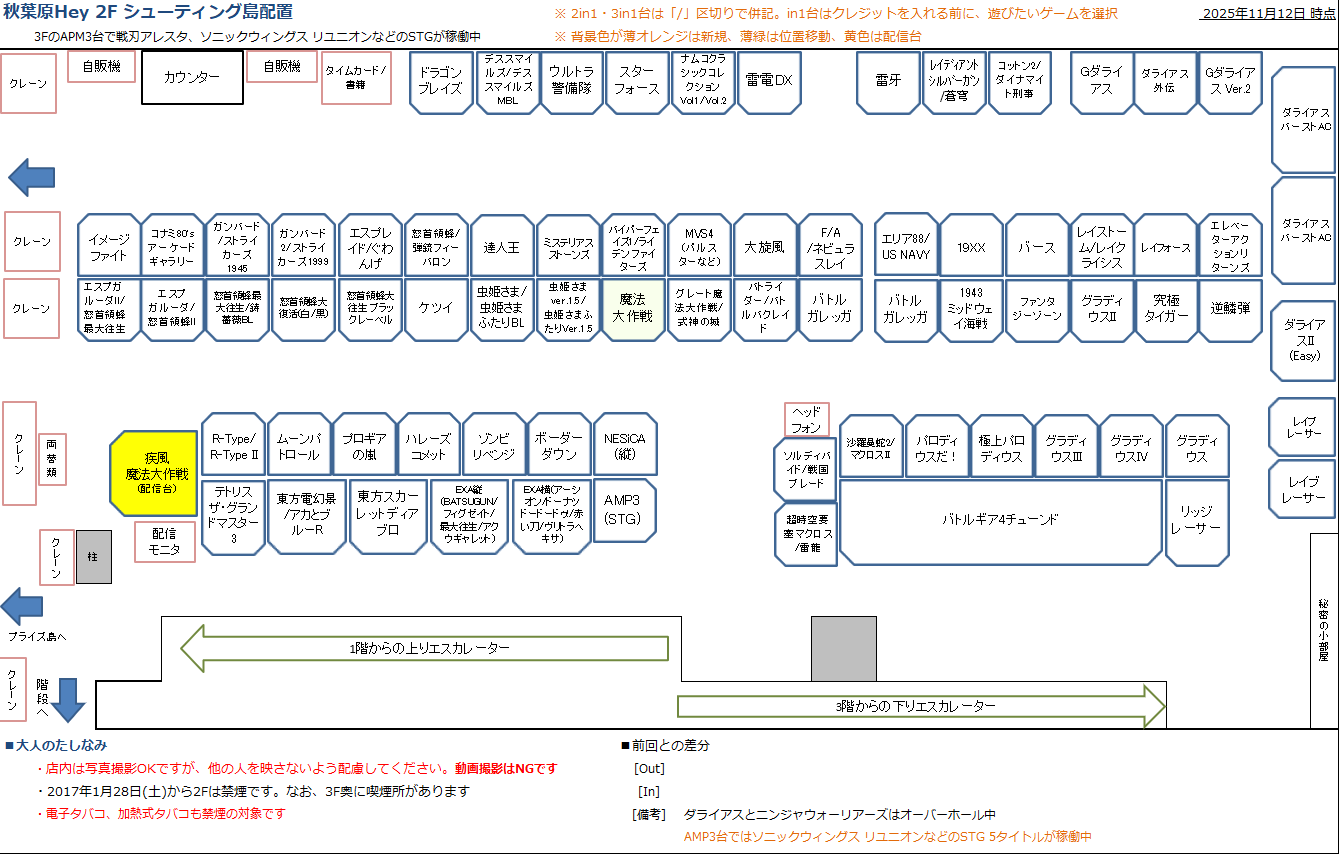 秋葉原Hey 2Fシューティング島の配置 2025-11-12 疾風魔法大作戦の配信が始まったので秋葉原Heyの配置図を更新した。 画像はクリックするとフルサイズになる(戻るにはブラウザの機能で)。 [Out] [In] [備考]ダライアスとニンジャウォーリアーズはオーバーホール中。2FのAMP3台ではソニックウィングス リユニオンなどのSTG 5タイトルが稼働中。 [配信] 秋葉原Hey 2F 手前配信台(ニコニコ) 秋葉原Hey 2F 手前配信台(YouTube) 秋葉原Hey 2F ダライアス側 or 3F配信台 (YouTube) Tweet Share on Tumblr Pocket