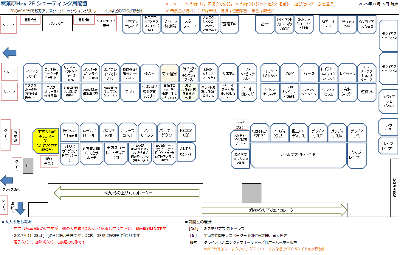 秋葉原Hey 2Fシューティング島の配置 2025-11-19 年末恒例の奇々怪界がはやめに登板したのと宇宙大作戦チョコベーダー CONTACTEE の配信が始まったのとで秋葉原Heyの配置図を更新した。 画像はクリックするとフルサイズになる(戻るにはブラウザの機能で)。 [Out]ミステリアス ストーンズ [In]宇宙大作戦チョコベーダー CONTACTEE、奇々怪界 [備考]ダライアスとニンジャウォーリアーズはオーバーホール中。2FのAMP3台ではソニックウィングス リユニオンなどのSTG 5タイトルが稼働中。 [配信] 秋葉原Hey 2F 手前配信台(ニコニコ) 秋葉原Hey 2F 手前配信台(YouTube) 秋葉原Hey 2F ダライアス側 or 3F配信台 (YouTube) Tweet Share on Tumblr Pocket