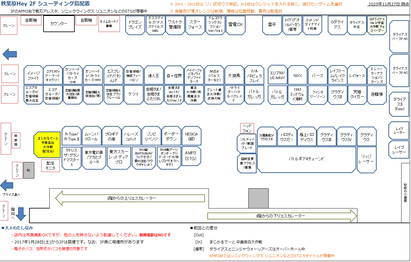秋葉原Hey 2Fシューティング島の配置 2025-11-27 まじかるでーと 卒業告白大作戦 の配信が始まったので秋葉原Heyの配置図を更新した。 画像はクリックするとフルサイズになる(戻るにはブラウザの機能で)。 [Out] [In]まじかるでーと 卒業告白大作戦 [備考]ダライアスとニンジャウォーリアーズはオーバーホール中。2FのAMP3台ではソニックウィングス リユニオンなどのSTG 5タイトルが稼働中。 [配信] 秋葉原Hey 2F 手前配信台(ニコニコ) 秋葉原Hey 2F 手前配信台(YouTube) 秋葉原Hey 2F ダライアス側 or 3F配信台 (YouTube)
