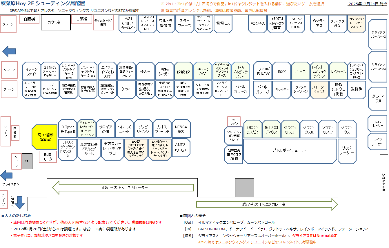 フォーメーションZ、レインボーアイランドなどが入ったのと年末恒例の奇々怪界の配信が始まったのとで秋葉原Heyの配置図を更新した。ダライアスIIは先週からNormal設定に変わっている。EXA台は2F 4台、3F 3台(うち2台は対戦台)に増えている。