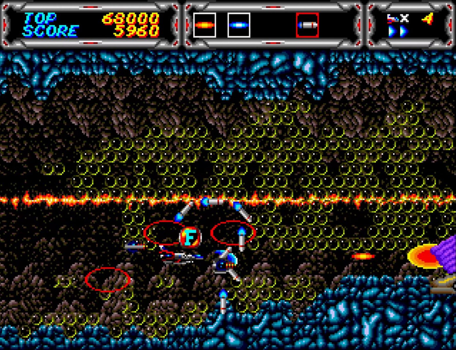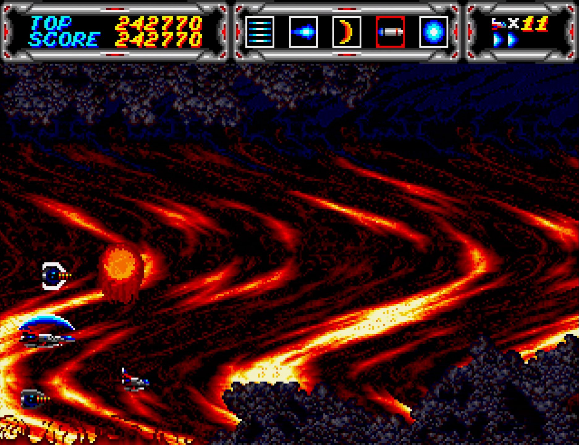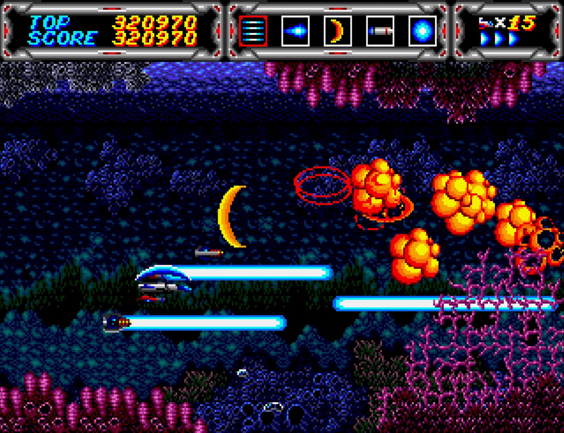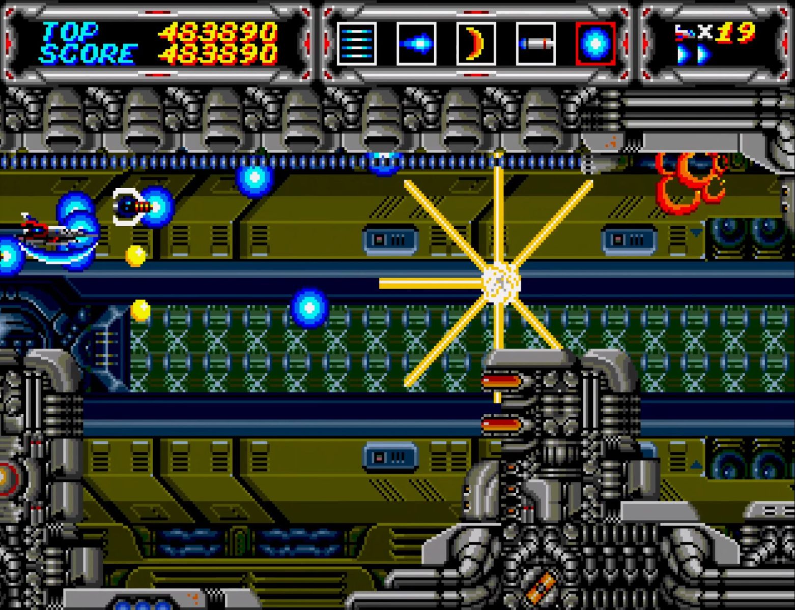 サンダーフォースIIIのROMは各国版で違いはないのだが、本体がJP国内用か海外用かで敵の堅さが変わるのもあって、ここのボスとか強気で最初からセーバー使えて気持ちいい。